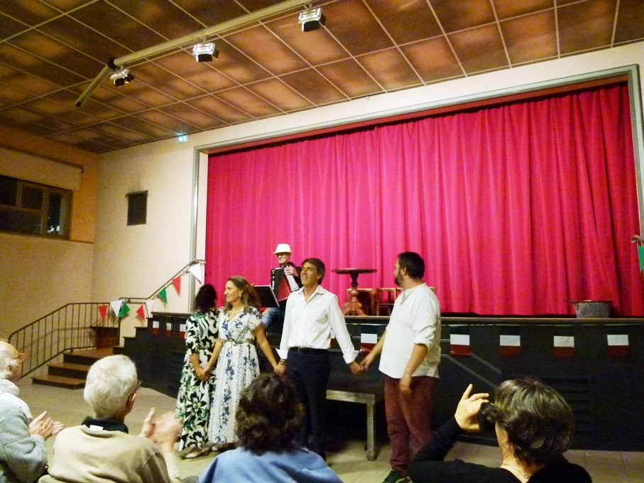 Le 13 septembre, à la salle des fêtes de BIOL, la Compagnie Arc-en-Ciel nous a conté l’histoire familiale de la Strega Nonna (une grand-Mère sorcière). Des retrouvailles sympathiques pour évoquer les anecdotes et les habitudes d’une famille italienne. Les spécialités culinaires n’étaient pas oubliées : des spaghetti ensorcelés, du tiramisu bien réel offert par les acteurs et pour finir le public a savouré et partagé le risotto / saucisson/champignons, dans la joie et la bonne humeur, comme il se doit aux accords de belles chansons italiennes reprises en chœur !